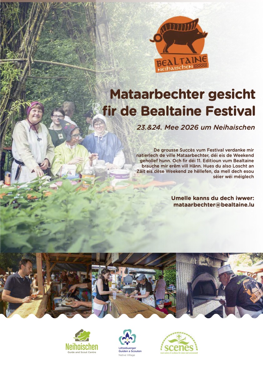 Mir sinn ëmmer erem iwwer de grousse Succès vun eisem Festival begeeschtert, deen net méiglech wier, ouni d’Mataarbechter, déi während dem Weekend un eiser Säit stinn. Fir déi 11. Editioun vum Bealtaine Festival brauchen mir erëm vill motivéiert Hänn! Hues de Loscht an Zäit, eis dëse Weekend ze hëllefen? Dann zéck net, a mell dech esou séier wéi méiglech!