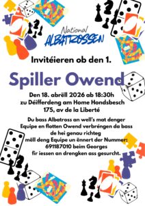 Mir bidden verschidden Gesellschaftsspiller un, wou der zesummen mat eis all kënnt spillen, et soll eng kleng Kompetitioun ginn. Fir iessen an gedrengk’s ass gesurcht.