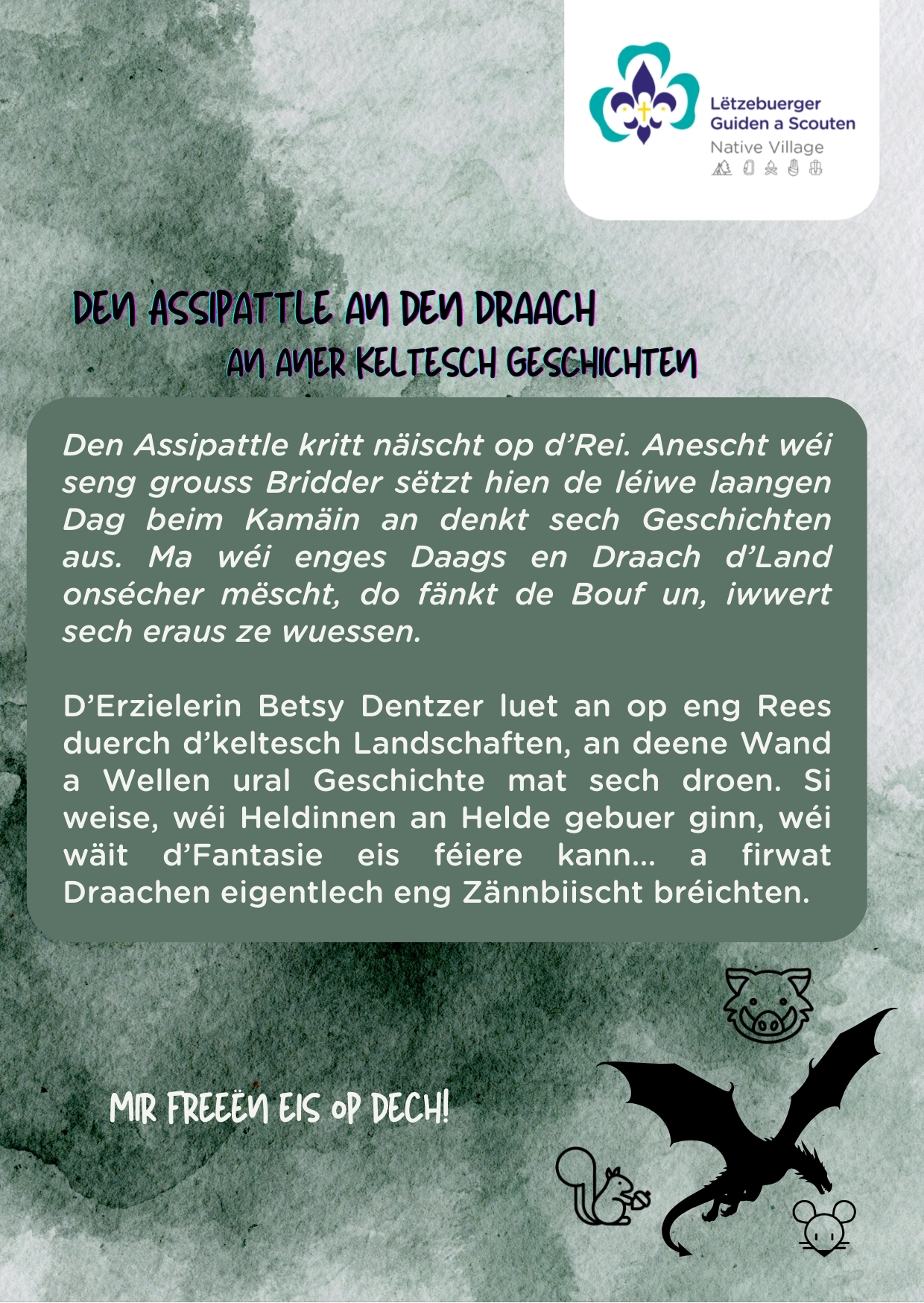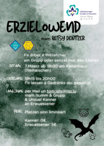 Den 7. Mäerz ab 18h30 fënnt e flotten Erzielowend iwwer Draachen an aner keltesch Geschichten mam Betsy Dentser am Keltenhaus statt.